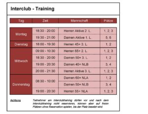Teilnehmer am Interclub-Training dürfen vor und nach dem Interclub-Training nicht reservieren, können aber auf freien Plätzen ohne Reservation spielen, bis der Platz besetzt wird.
